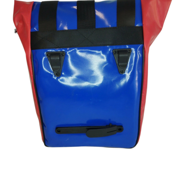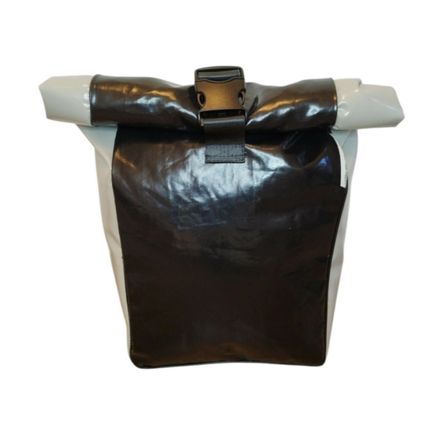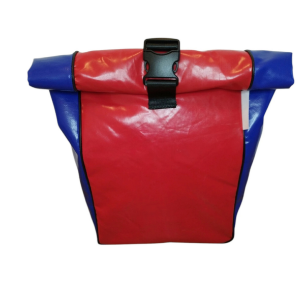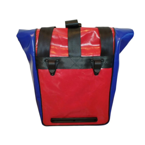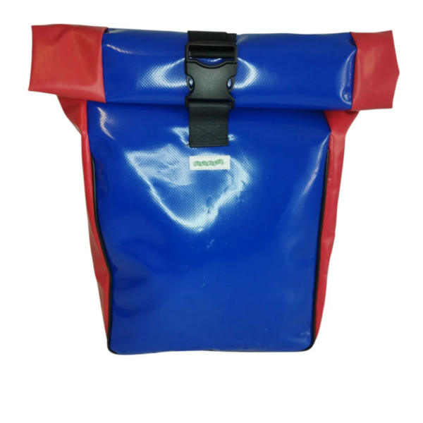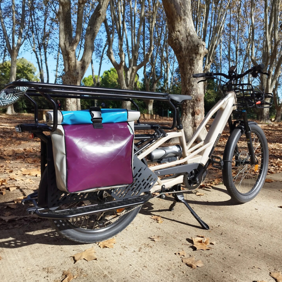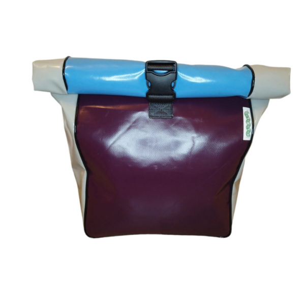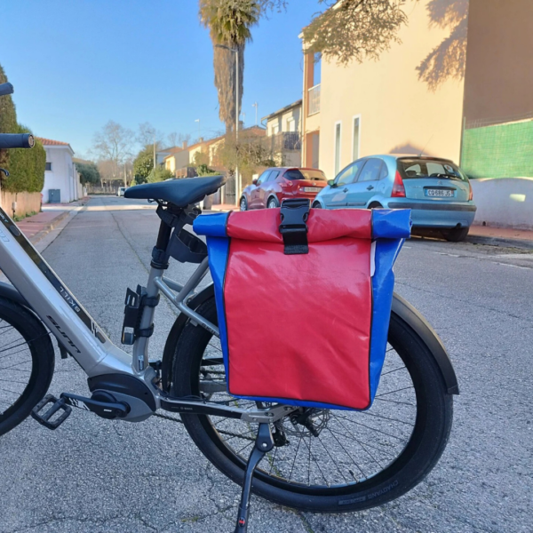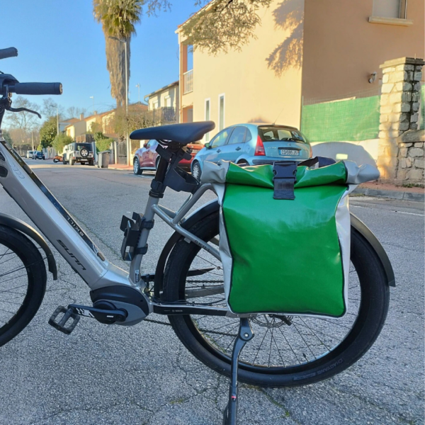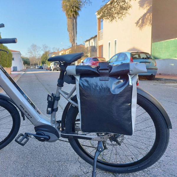Sacoche de vélo « roll-top » en bâche de camion et ceinture de sécurité. Sacoche résistante et imperméable qui vous accompagnera aussi bien dans vos trajets vélotaf que dans vos escapades à la campagne.